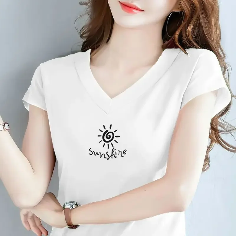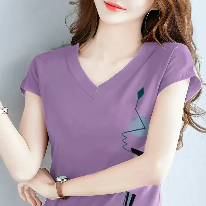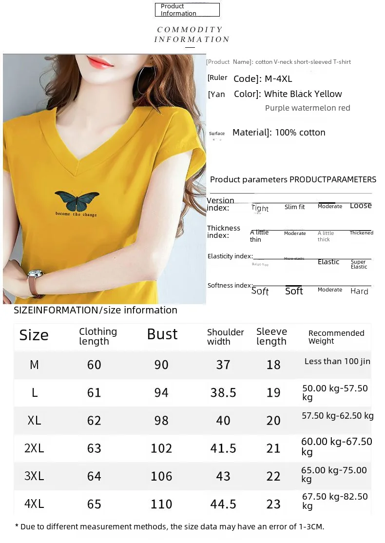 2024 New 100% Cotton Loose Plus size women clothing V-neck Short sleeve T-shirt Middle-Aged Mother Summer Clothing