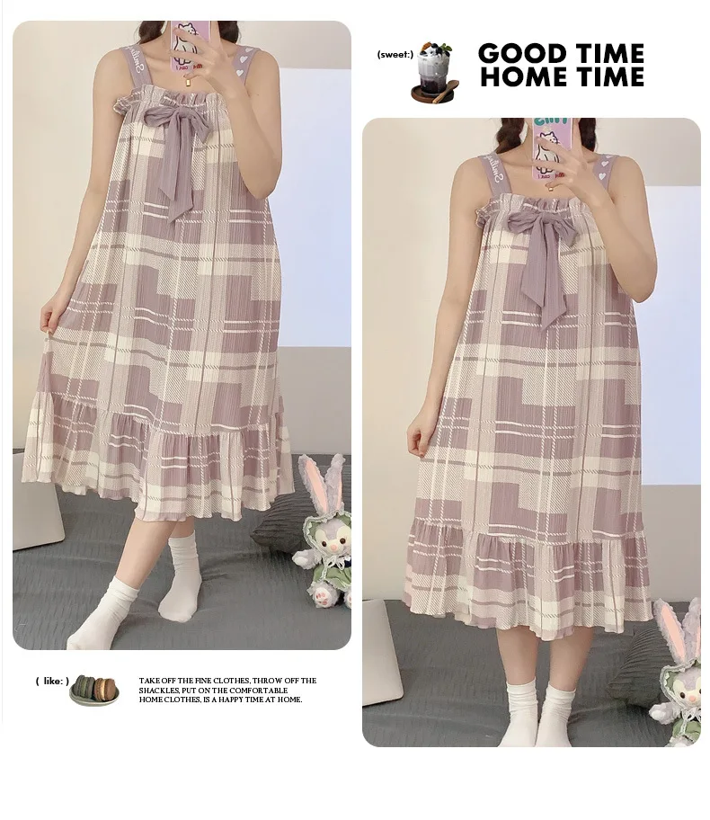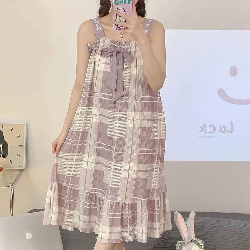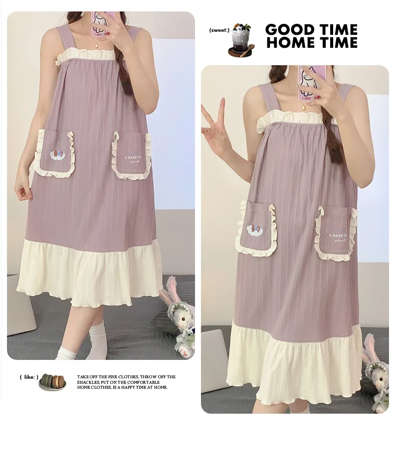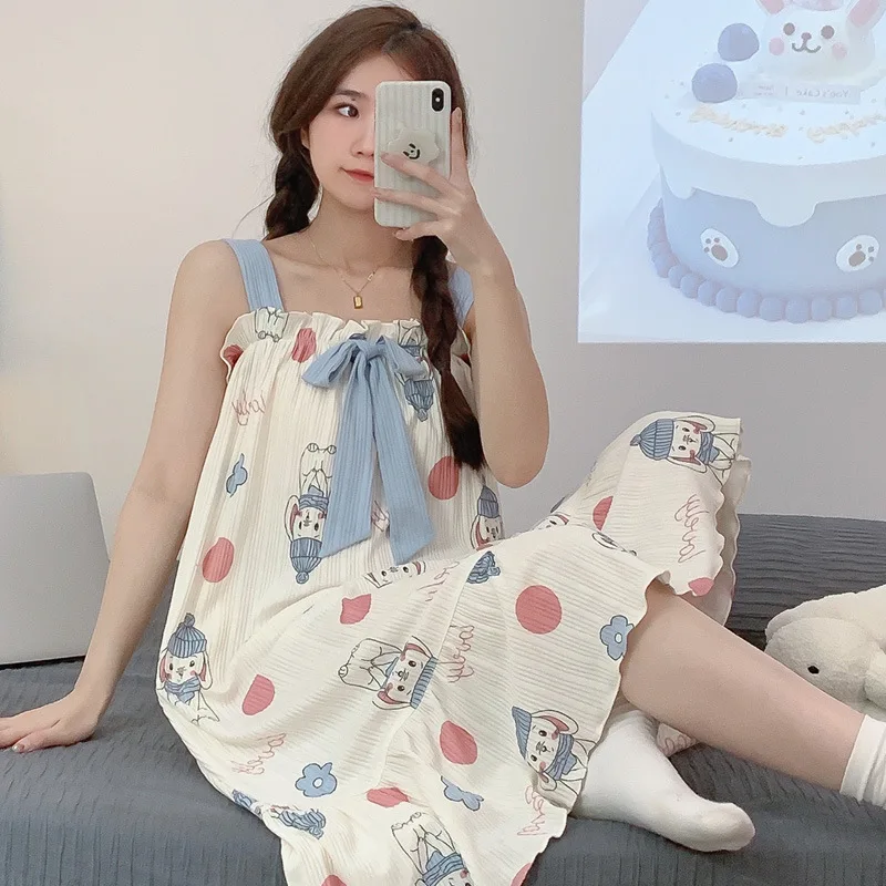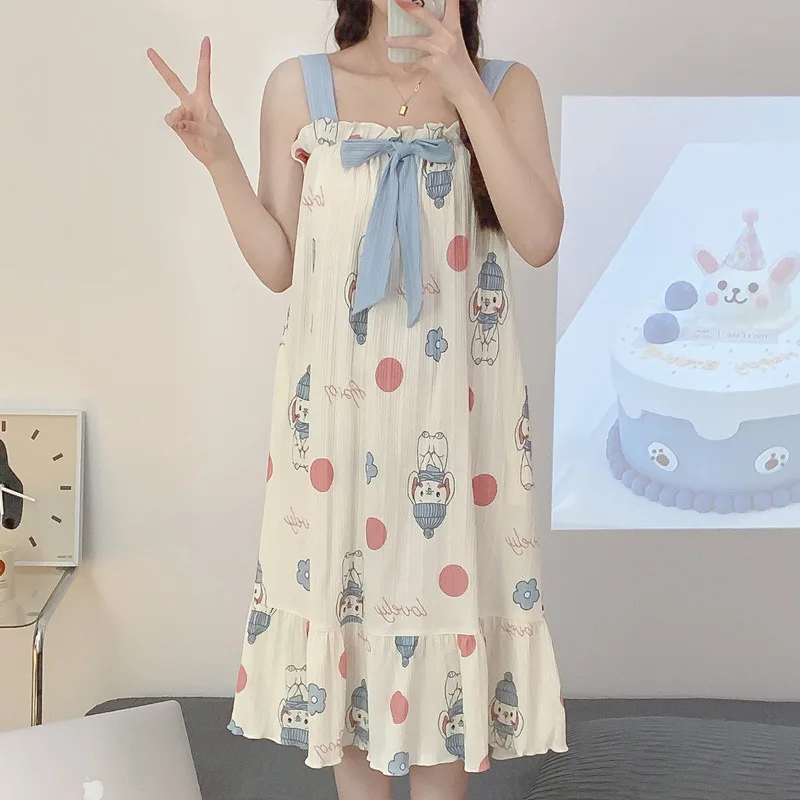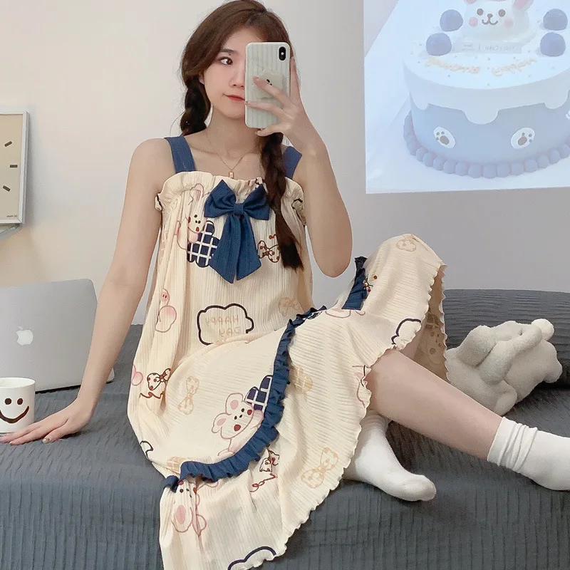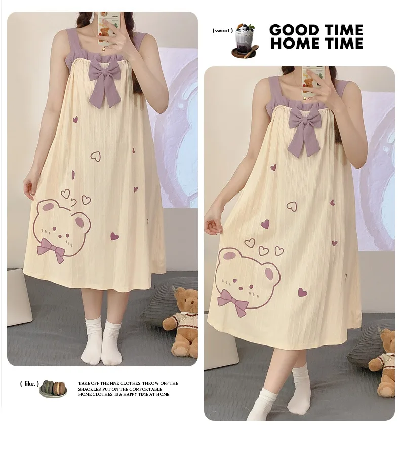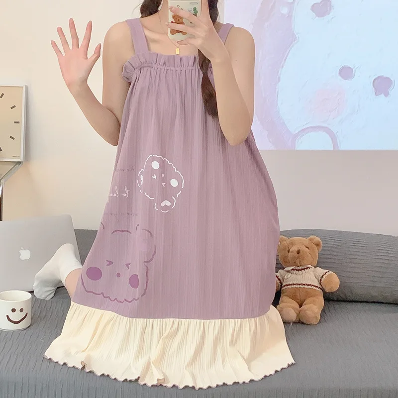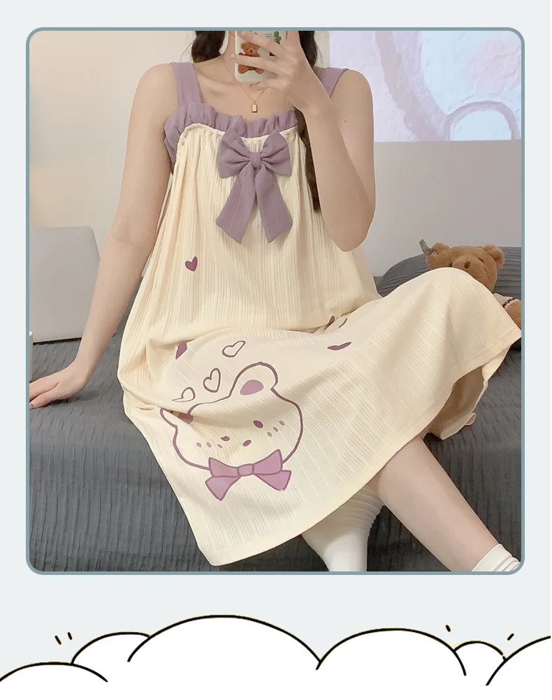 Women Nightgowns Cotton Sleepwear Dress Princess Night Dress Bear Print Night Gown One Piece Pajamas Sling Sleeveless Nightwear